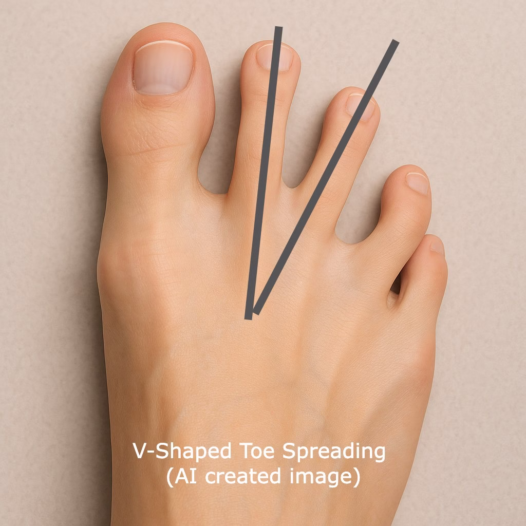 • Bunions (Hallux Valgus): The big toe drifts toward the second, pushing it aside and widening the space.